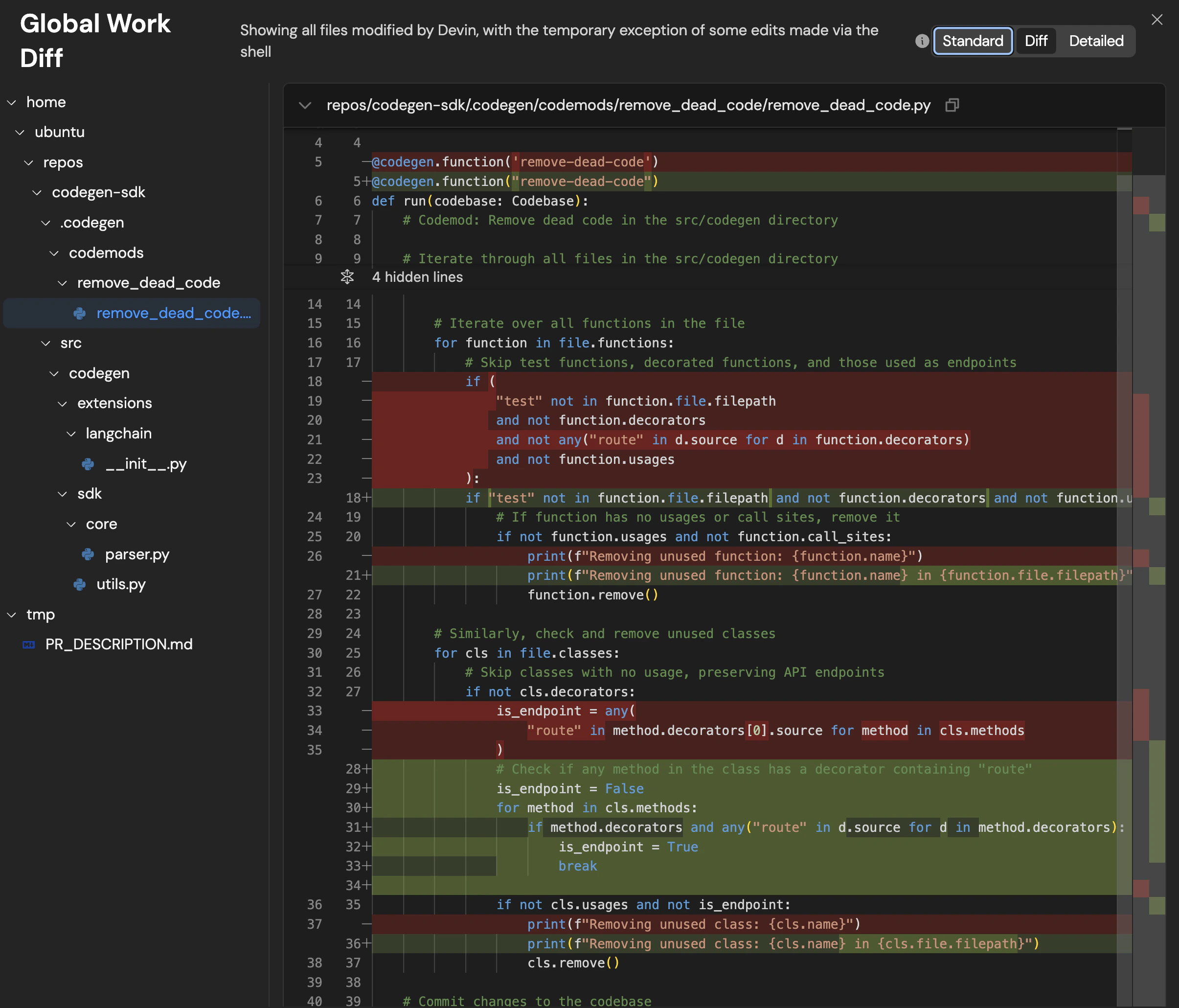 Want to experience this with your own Devin instance? Install the Codegen CLI in your Devin box:Dead Code Deletion Prompt